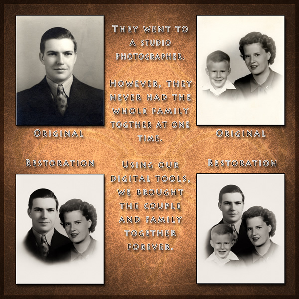 It’s never too late to restore or enhance a treasured photograph. We can bring your old or damaged photographs back to life. We will schedule a session to review your photos and discuss what you want.We can restore and enhance your photos in the following ways: